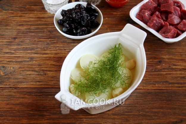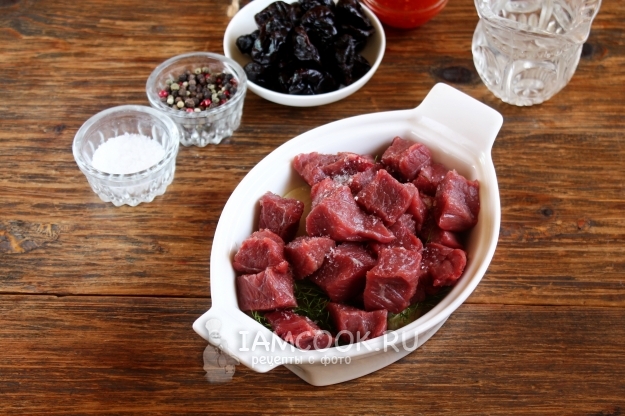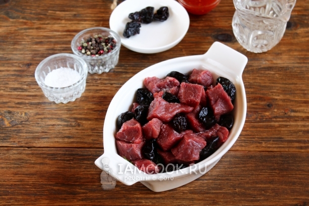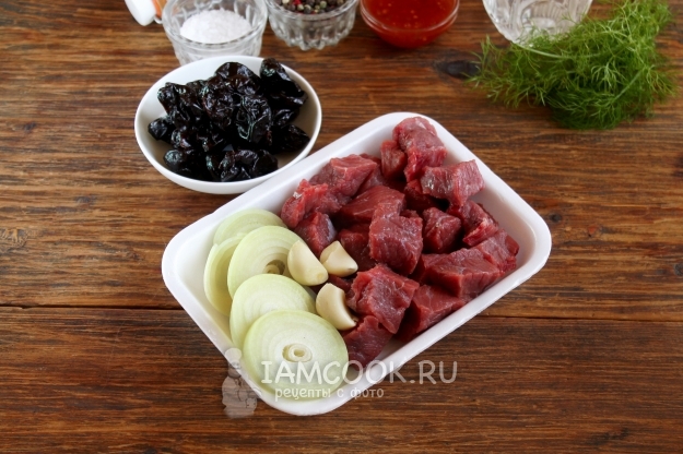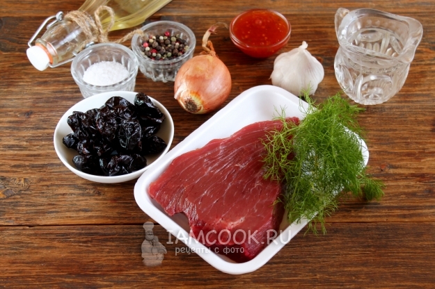 Продукты для приготовления тушеной говядины с черносливом в духовке возьмите по списку ингредиентов. Лучше — мясо свежее, если необходимо, предварительно разморозьте.