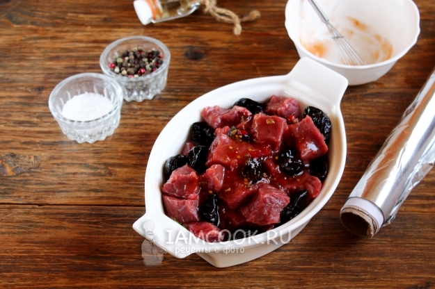 Сладкий соус чили или другой разводим в 100 мл воды (лучше — кипятка) и заливаем мясо с черносливом. Накрываем листом фольги, отправляем для тушения в заранее разогретую духовку на 40-60 минут, держим при температуре 170 градусов.