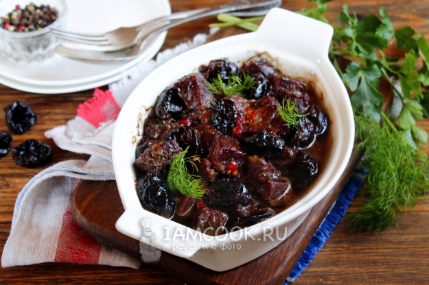 sdБлюдо для самостоятельной подачи (с зеленью, салатами из свежих овощей) и под любой гарнир (рис, пюре, паста, проч.) — вкусная, ароматная говяжья мякоть, тушенная в духовке с черносливом.