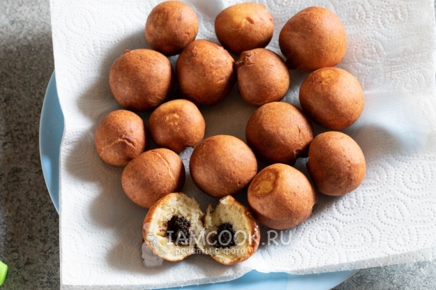 Фритируем пончики в предварительно разогретом растительном масле, в большом количестве - таком, чтобы пончики были полностью им покрыты и могли всплыть. В самом начале, после попадания в масло, они любят прилипать ко дну. От дна их все нужно аккуратно отделить ложкой вскоре после того, как они к нему приклеятся. Обжаривание производится до коричневатости поверхности пончиков. После извлечения из кастрюли с маслом пончики с маком следует обсушить на бумажной салфетке.