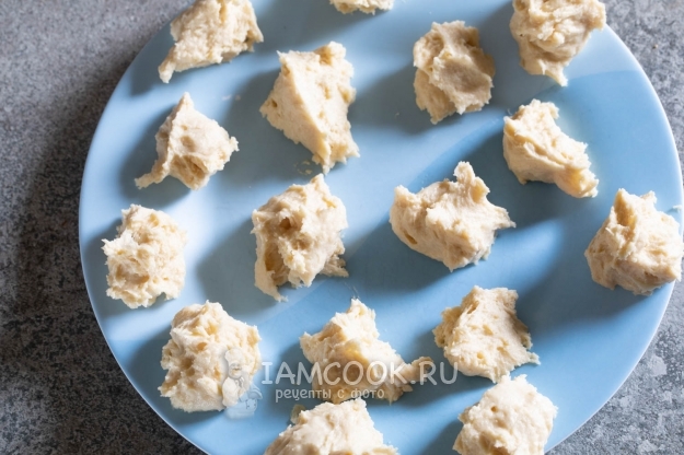 Смазанными в масле руками отщипываем небольшие порции теста. Если есть рассадочный шприц с дозатором, то им можно даже высадить абсолютно одинаковые порции!