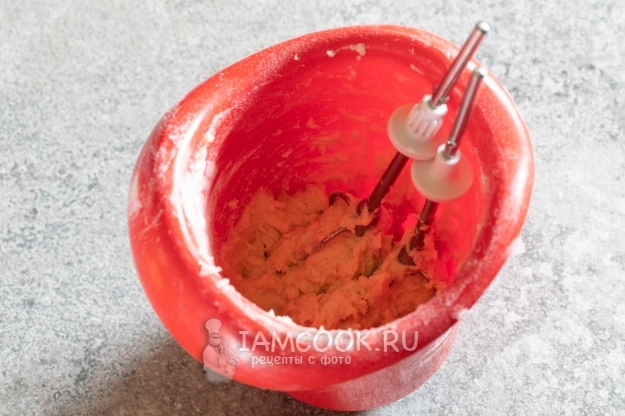 Смешиваем тесто из яйца, обоих видов сахара, творога, муки и щепотки разрыхлителя. Оно должно быть достаточно жидким, но уже лепким, а не текучим.