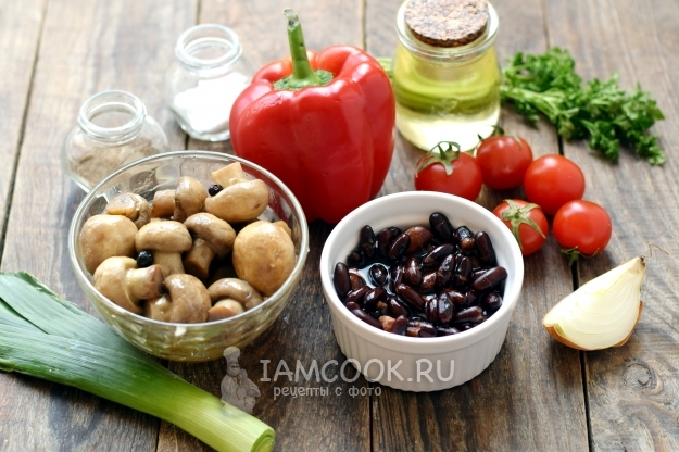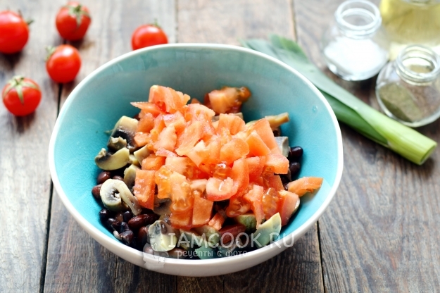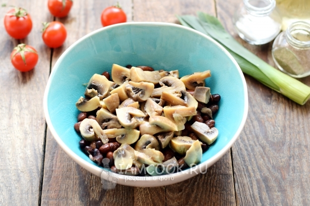 Маринованные грибы также освободите от маринада (промывать не нужно), обязательно удалите пряности — перец горошком, чеснок, лавровый лист. Грибы нарежьте кусочками среднего размера, добавьте к фасоли.