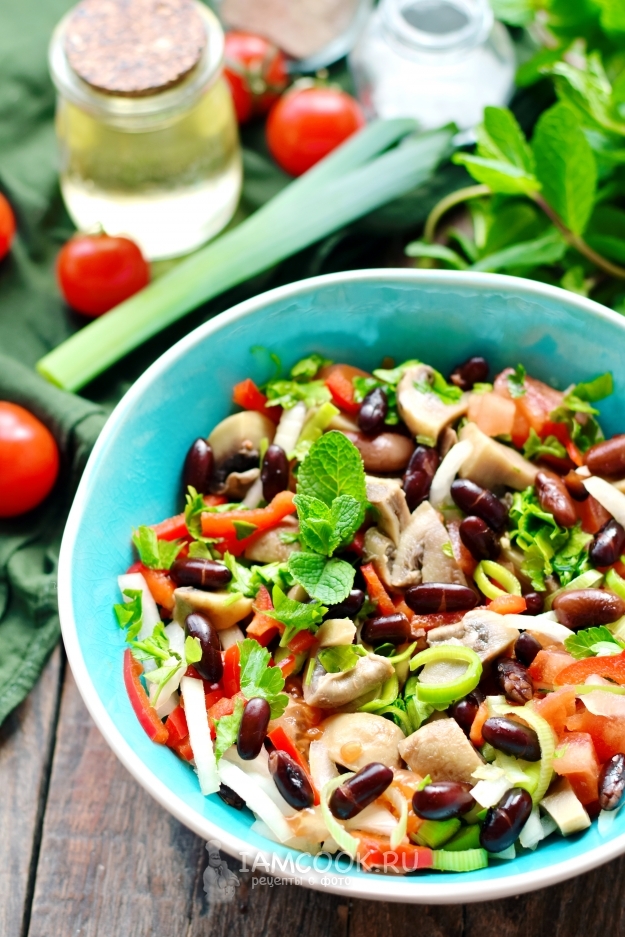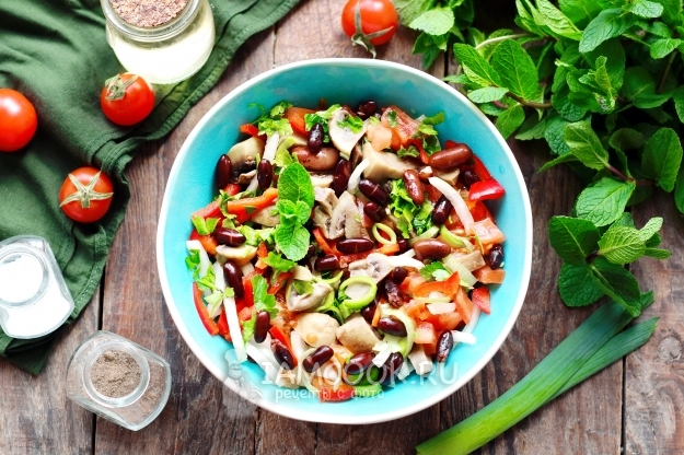 Постный салат с фасолью, маринованными грибами и овощами готов к употреблению, его можно сразу подавать на стол.