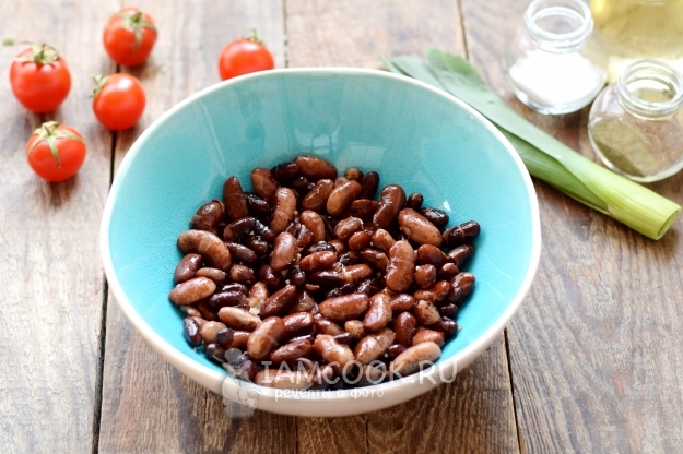 Консервированную фасоль из банки перекиньте в дуршлаг, промойте под проточной водой, полностью избавляя бобовую культуру от клейкого маринада. Оставьте фасоль в дуршлаге на время, чтобы стекла вся вода, затем перекиньте ее в глубокую тарелочку.