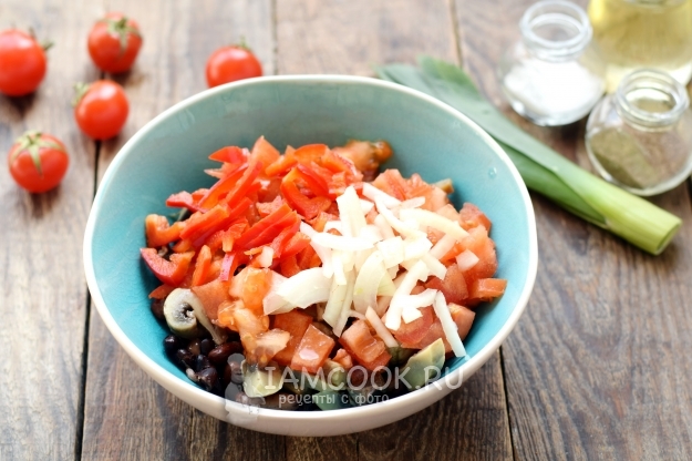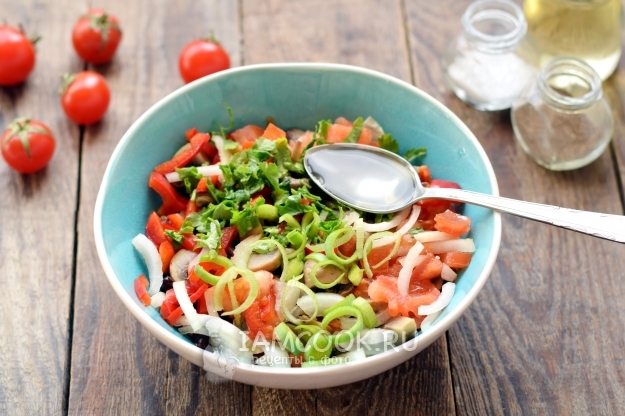 Лук-порей нарежьте кольцами, петрушку мелко нашинкуйте. Зелень добавьте к основному составу. Смесь заправьте растительным маслом, присыпьте солью и перцем, перемешайте.