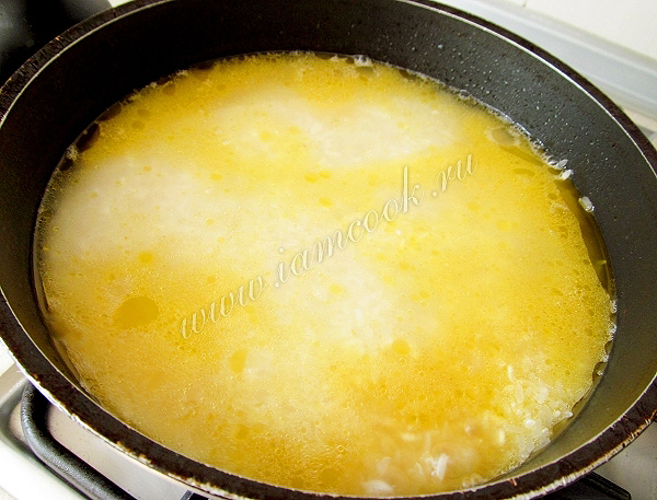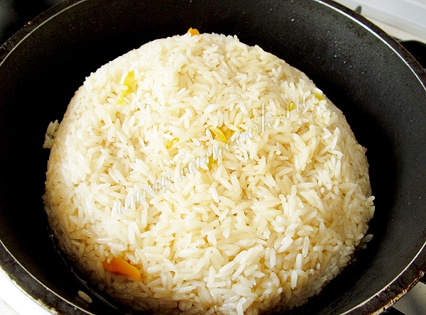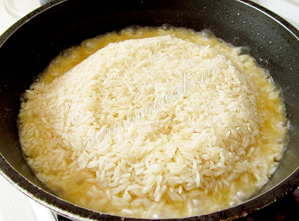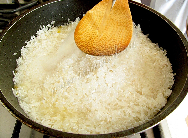 Солят и наливают горячую воду через шумовку или лопатку. Вода должна покрывать рис на 1 см. Это зависит от сорта риса и его способности вбирать воду.