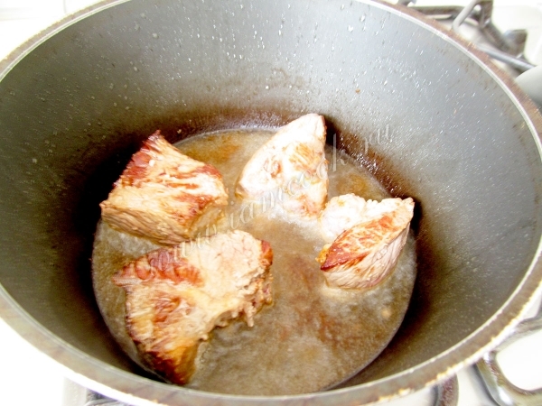 Поставить казан на огонь и накалить его. Затем налить масло и тоже разогреть почти до дыма. Это нужно делать обязательно, чтобы потом у вас ничего не пригорело и не прилипло. Опустить в горячее масло крупные куски мяса. Осторожно - брызги! Быстро накройте крышкой казан. Затем крышку нужно будет открыть и обжаривать мясо на сильном огне до золотистого цвета. Главное- это запечатать мясные соки.
