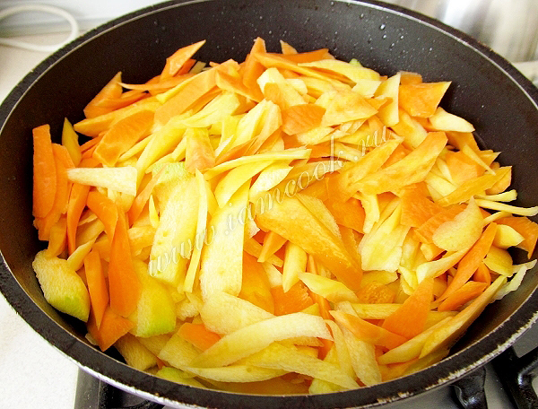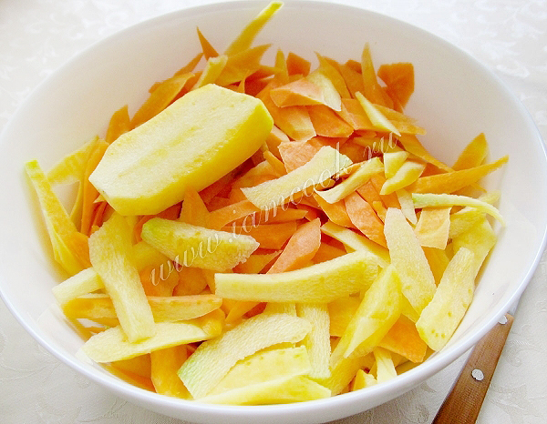 Настоящий плов по времени готовится не спеша, не менее 2 часов, поэтому начнем издалека ... Морковь вымыть и нарезать стружкой вручную. Так нарезают морковку для плова только в Хорезме.