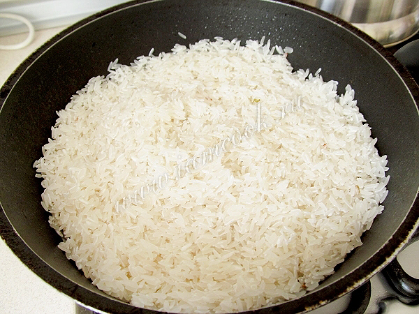 Затем очередь риса. Его промывают несколько раз от лишнего крахмала до полной прозрачности воды. Для ташкентского плова вообще рис замачивают в воде на час. Выкладывают рис поверх моркови, разравнивая.