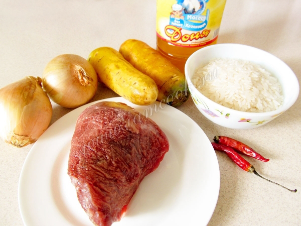Сегодня я хочу познакомить вас с пловом По-хорезмски. Я считаю, что это самое здоровое блюдо, приготовленное более правильным способом. В его состав не входят специи и они не перебивают вкус и аромат самого плова. Овощи не пережариваются в большом количестве масла, но вкус и аромат у этого плова просто изумительный. Признаюсь, что у меня не сразу получился правильный результат и правильность эта выражалась не в рассыпчатости риса, а именно в правильном запахе этого плова. Несколько слов хочется сказать о рисе. Для хорошего плова не годится любой рис. Это обязательно должен быть рис твердых сортов, с малым содержанием крахмала, предпочтительнее сорта аланга, лазер, девзира ... Морковь желательно тоже брать желтую, но такую выращивают только в Узбекистане. В Узбекистане принято готовить плов на хлопковом масле, у него особенный вкус и запах, для других блюд я не использую это масло.