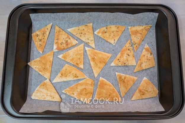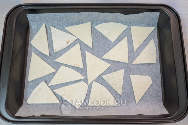 Итак, лаваш или, как в моем случае, тортилью нарежьте произвольно. Безусловно, мельчить не стоит. Тортилью диаметром 20 см я разрезала на 8-10 частей. Получились вот такие треугольники.