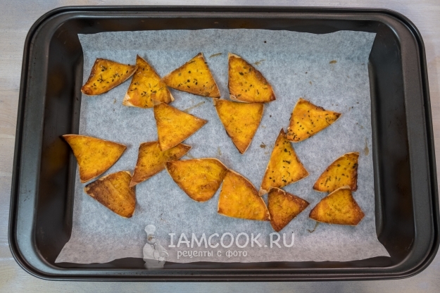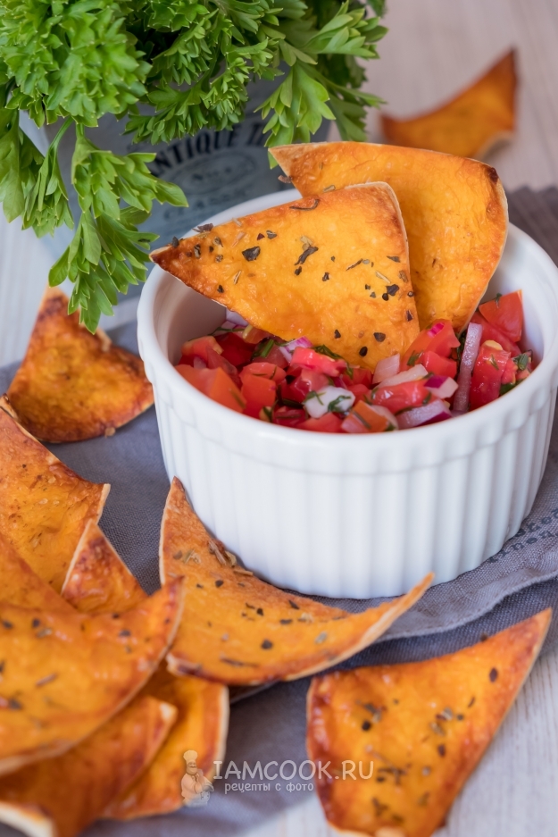 Очень вкусно подать такие чипсы с какой-нибудь сальсой, соусом, дипом.