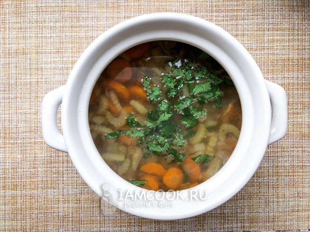 Мелко порубите зелень, добавить в суп. Выключите огонь и дайте супу настояться.
