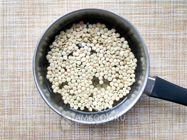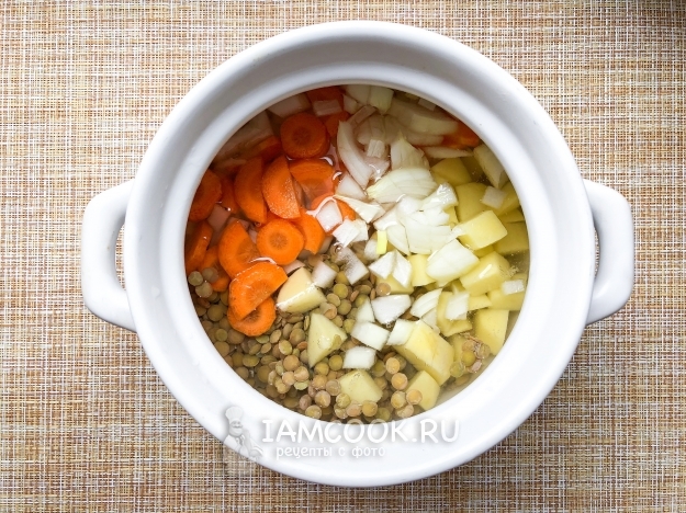 Сложите чечевицу и овощи в кастрюлю, добавьте 1 л воды. Доведите до кипения и варите на среднем огне под крышкой 20 минут.