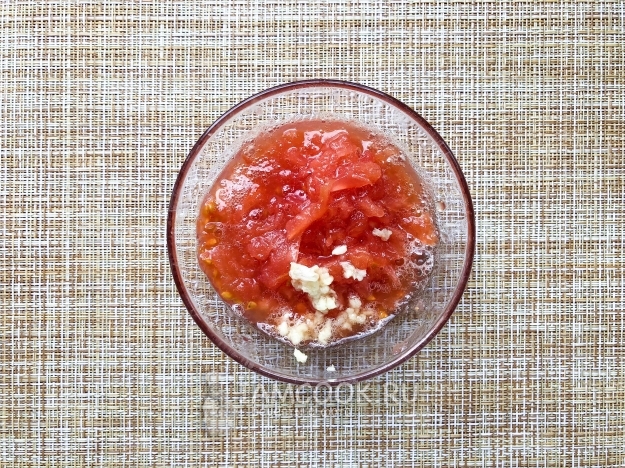Помидор натрите на терке, а чеснок продавите через пресс.