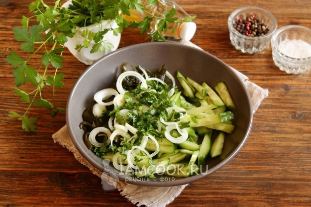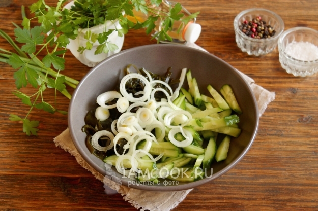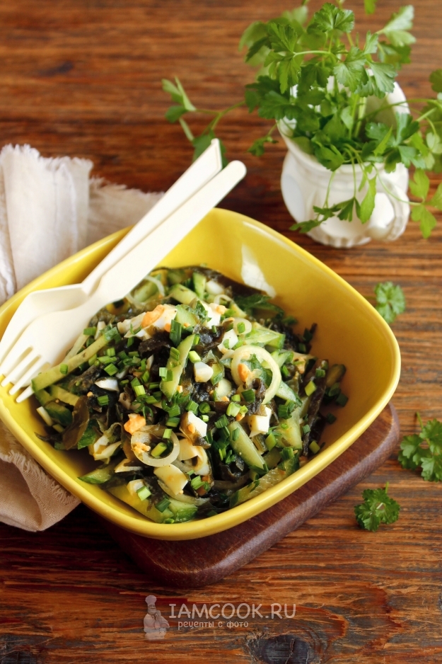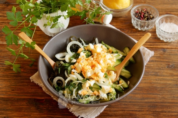 Пропитка не нужна — подаем салат из морской капусты с яйцом, огурцом и луком сразу же.