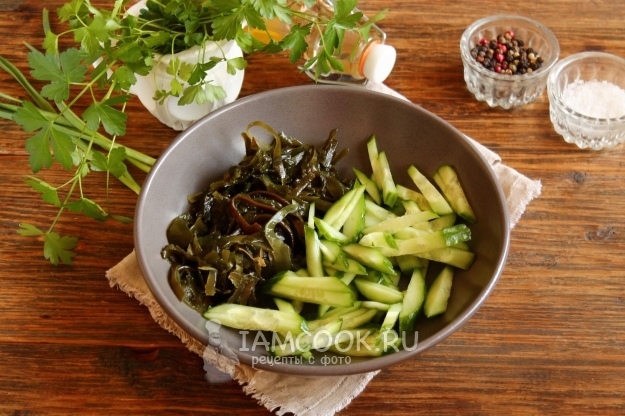 К вороху морской капусты добавляем свежий огурец — шинкуем короткими брусками или другим удобным способом.