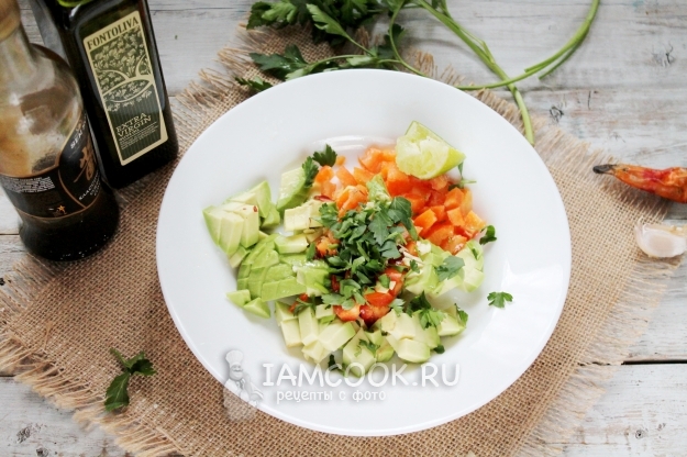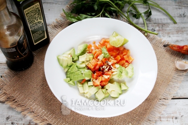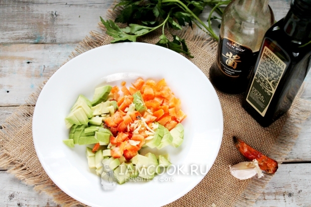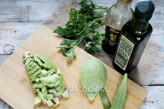 Очистите от кожицы спелый авокадо, нарежьте его кубиком среднего размера.