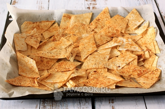 Выложите будущие чипсы прямо с пергаментом на противень и поместите в разогретую духовку на 10 минут. Температура духовки - 170 градусов. За это время несколько раз достаньте чипсы и перемешайте. Время, проведенное в духовке, может разниться в зависимости от ее модели.