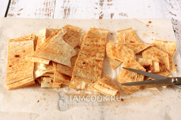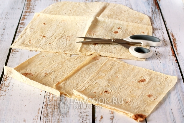 Для меня этот способ оказался проще. Лаваш нарежьте на крупные квадраты. Совсем не обязательно его резать ровно. Можно разрезать по линиям сгиба или как вам нравится.