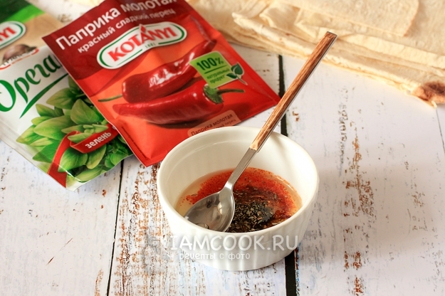 Приготовьте масло для пропитки. Для этого добавьте в него все специи, соль, чесночный порошок и хорошенько разотрите. Количество соли регулируйте по вкусу сами.