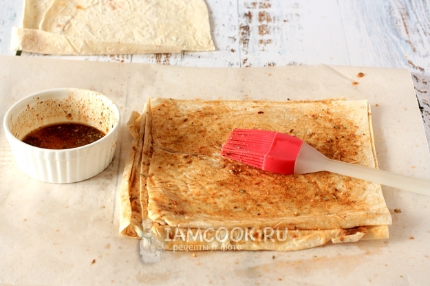 Далее разложите на столе лист пергамента, чтобы удобнее было работать. Смажьте верхнюю сторону лаваша полученной пропиткой и сложите квадраты друг на друга, слегка прижимая их. Так они пропитаются равномерно с двух сторон.