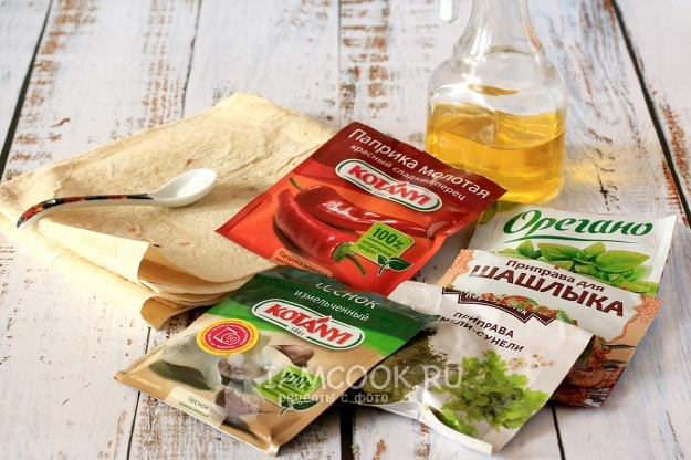 Понятное дело, что в чесночные чипсы в обязательном порядке входит чеснок. Я готовила их с чесночным порошком, это проще. Растворяется порошок в масле без остатка, быстро и равномерно распределяется. Еще добавила свои любимые специи для аромата. Чипсы получаются как из магазина, но еще вкуснее.