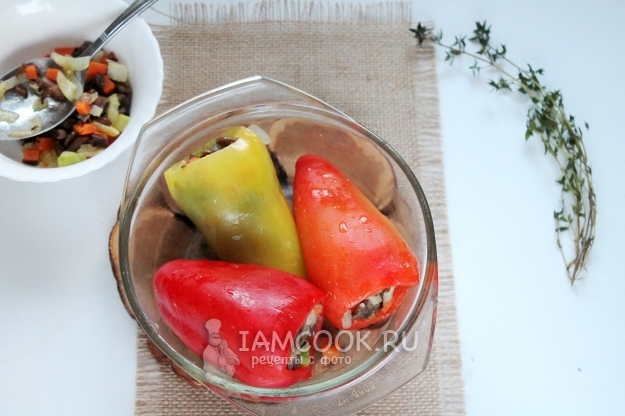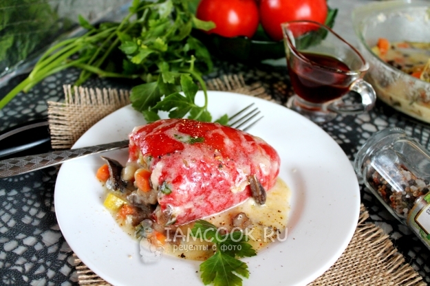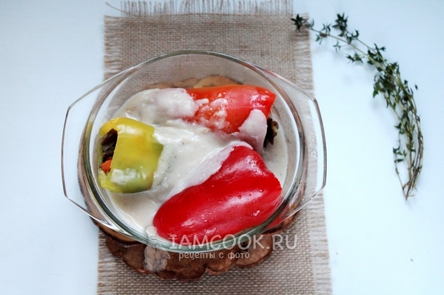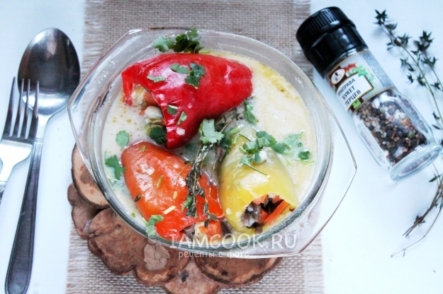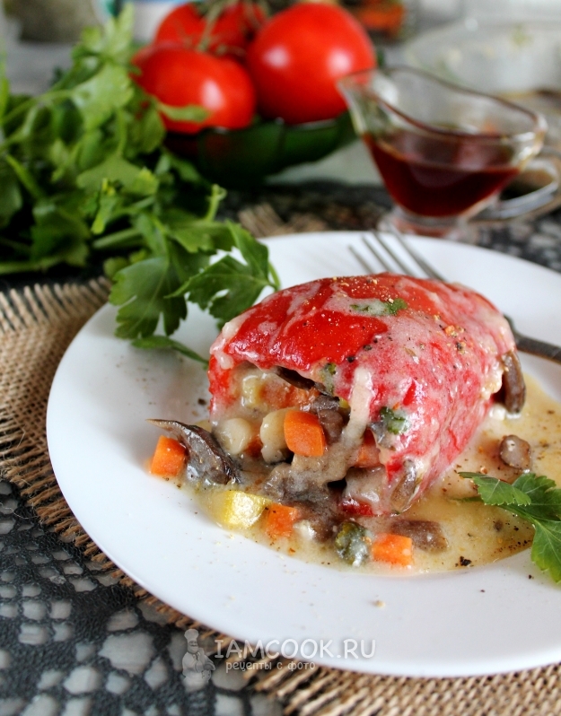 Перец, фаршированный овощами и грибами, в сметане готов.