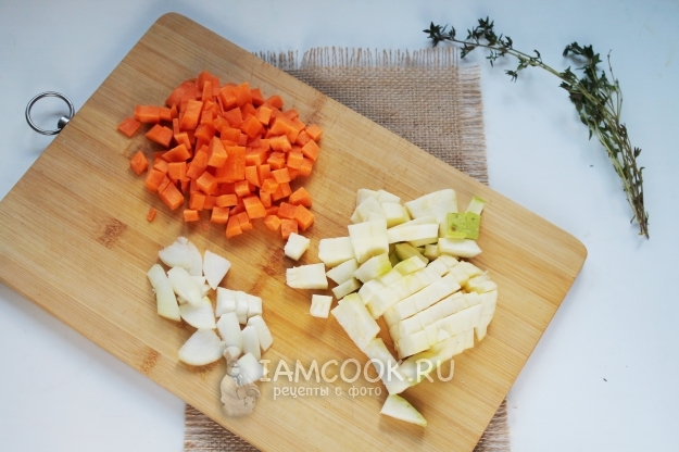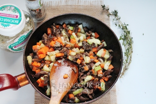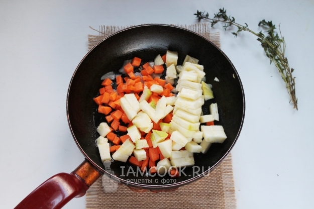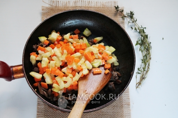 Разогрейте на сковороде масло и обжарьте сначала немного лук до прозрачности, потом добавьте морковь и цукини и потушите до полуготовности. Овощи переложите на тарелку.
