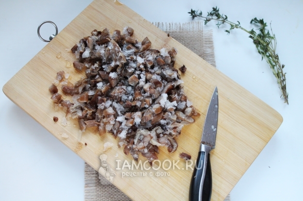 Заправьте фарш солью, смесью перцев, листочками тимьяна.