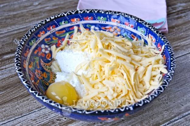 За это время приготовила начинку из творога, тертого сыра и яйца, визуально разделила на 4 равные части.