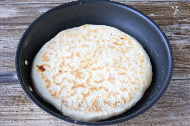 На сухую разогретую сковороду выложила заготовку, накрыла крышкой и жарила на умеренном огне до румяности с одной стороны, затем перевернула и обжарила с другой стороны.