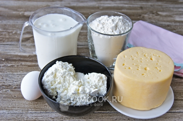 Итак, подготовим все необходимые продукты для приготовления хачапури с творогом и сыром на кефире.