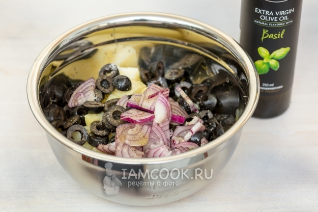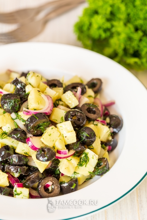 Если у вас уже есть такая картошка, можно приготовить картофельный салат с оливками и луком. Это блюдо можно подать и как салат, и как вполне себе самостоятельное блюдо, и как гарнир.
