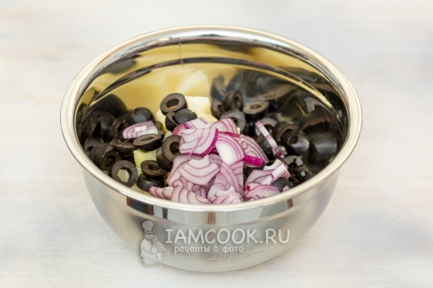 Добавьте нарезанные колечками оливки и лук, нарезанный четверть-кольцами.