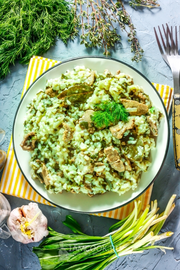 Зелёный плов Бахш не столь популярен, как обычный узбекский плов, но не менее вкусен и полезен. Такое сытное и питательное блюдо создают ранней весной и летом в сезон сбора сочной ароматной зелени, которая и придает ему цвет. В основном, за окрас плова "отвечает" шпинат, поэтому его постарайтесь приобрести в первую очередь. Затем по списку традиционно следуют петрушка и укроп, зеленый лук, если есть - черемша. Кстати, последнюю можно добавить чуть больше указанной нормы: если вы любите пикантный вкус в блюде - она заменит чеснок. Хотя я советую все же добавить пару зубчиков для аромата.