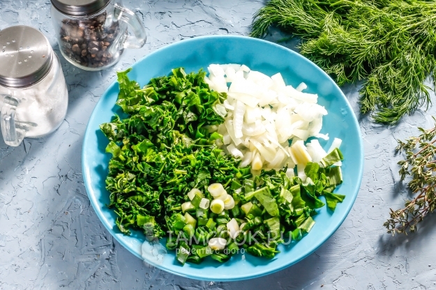 Промойте очищенный репчатый лук и многочисленную зелень. Нарежьте лук мелкими кубиками, а зелень измельчите.