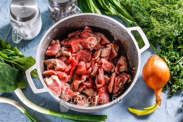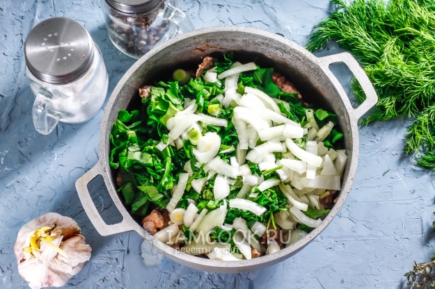 Когда говядина протомится, выложите в емкость нарезку зелени и репчатого лука.
