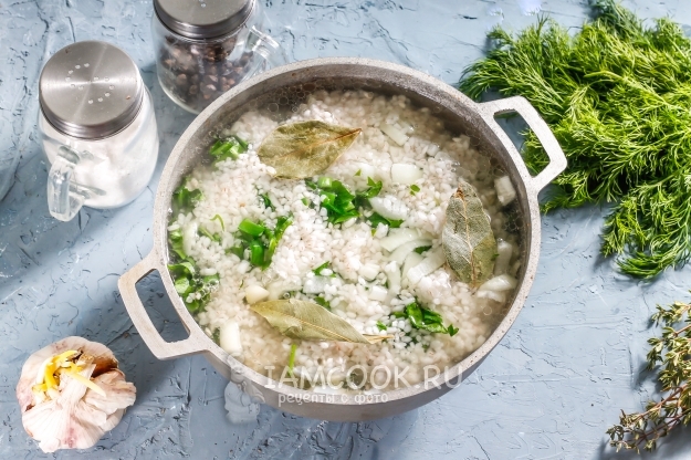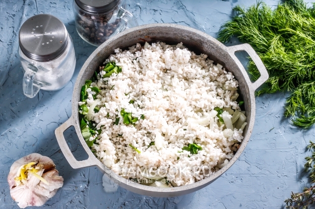 Очистите пару зубчиков чеснока и добавьте туда же. Выложите промытый рис, посолите и поперчите.