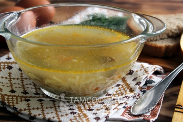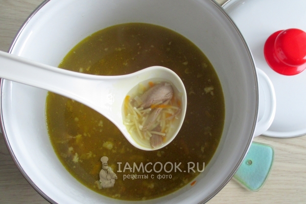 Доваривайте суп на слабом огне около пяти минут, т.е. до готовности вермишели. В готовый суп верните мясо цесарки.