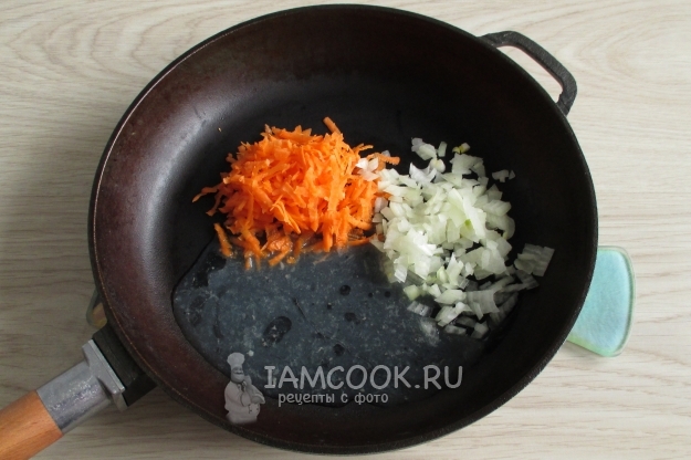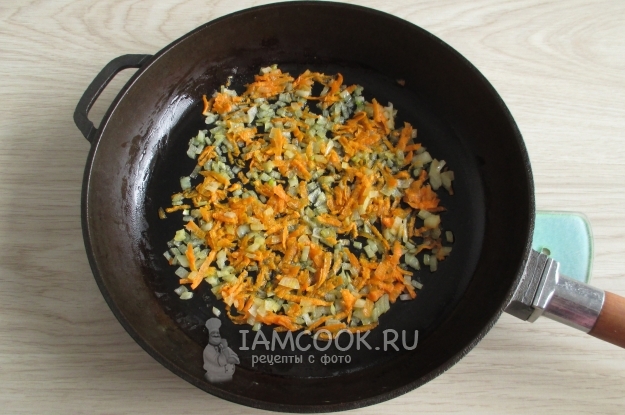 Лук нашинкуйте мелким кубиком, а морковь крупно натрите. Припустите овощи на сковороде на бульоне, снятом сверху, т.е. с плавающими каплями жира. Слегка посолите.