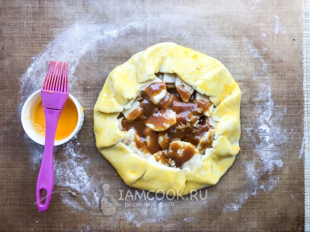Смазать тесто желтком, полить карамелью и выпекать 35 минут при температуре 190 градусов.