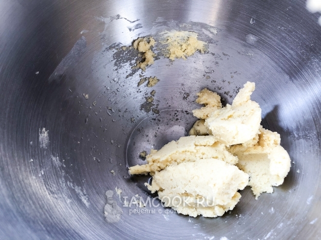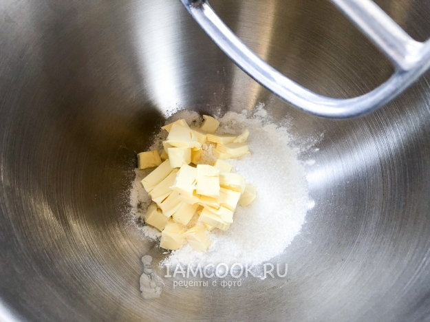 Сливочное масло нарежьте на кубики. Перетрите его с мукой и сахаром (25г), добавьте щепотку соли. Сделать это можете с помощью блендера, миксера или вручную.