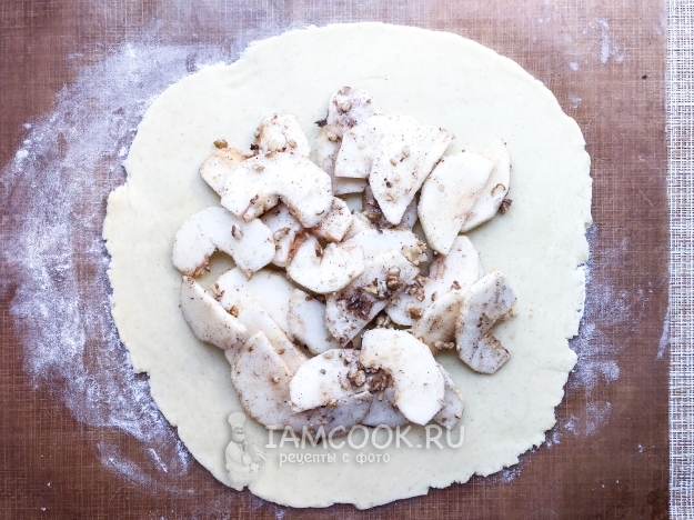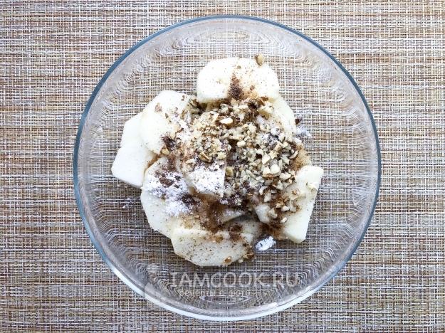 Яблоко очистить, нарезать на дольки. Смешать его с лимонным соком, 1 ст.л. сахара, корицей, кукурузным крахмалом и измельченными орехами.