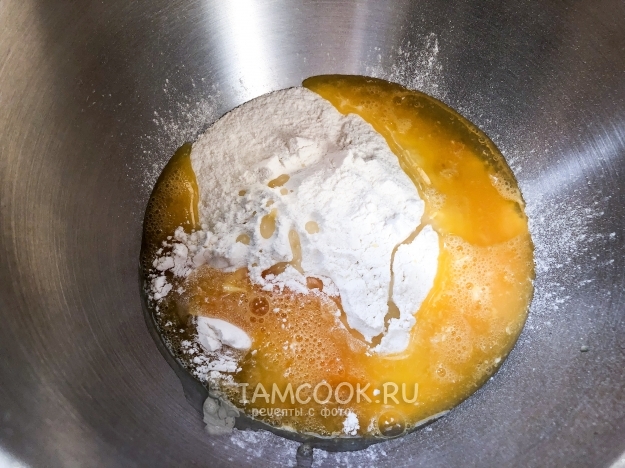 Добавьте яйца и подсолнечное масло к муке. Вымешивайте тесто рукой либо насадкой "крюк" для миксера.