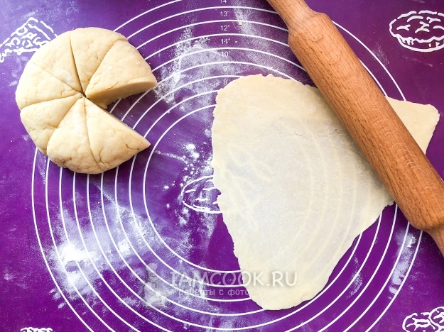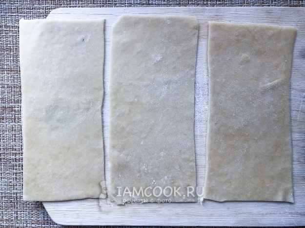 Разделите тесто на равные части и тонко раскатайте каждый кусочек.