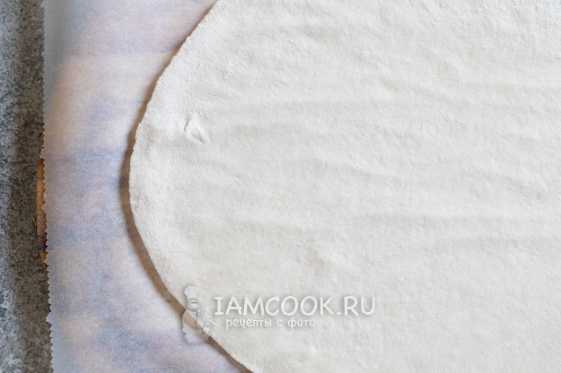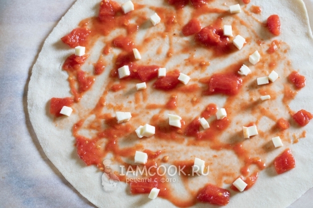 Очень тонким слоем намазываем на тесто консервированные помидоры для пиццы, посыпаем моцареллой и солью. Соли должно быть немного, у нас ещё прошутто и пармезан будут.
