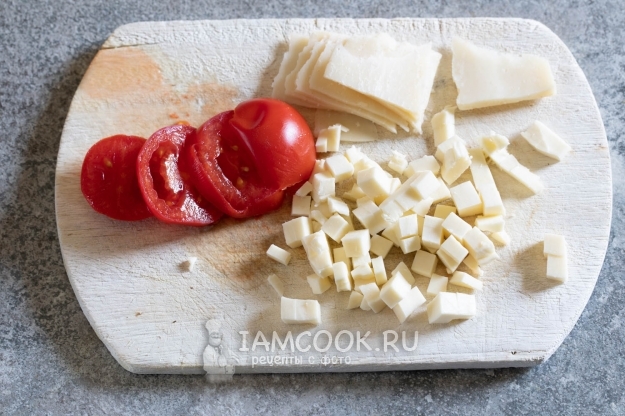 Помидор режем на тонкие шайбочки; моцареллу - либо трём на крупной тёрке, либо режем на мелкие кубики; пармезан строгаем тонкой стружкой.