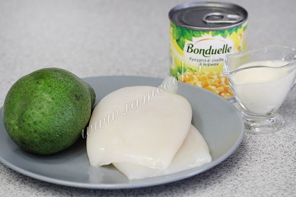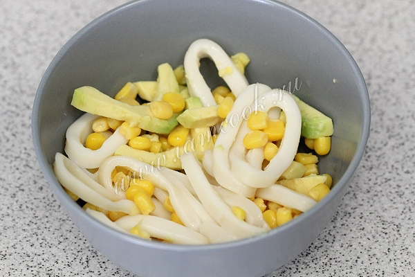 Смешаем авокадо, кальмары и кукурузу.
